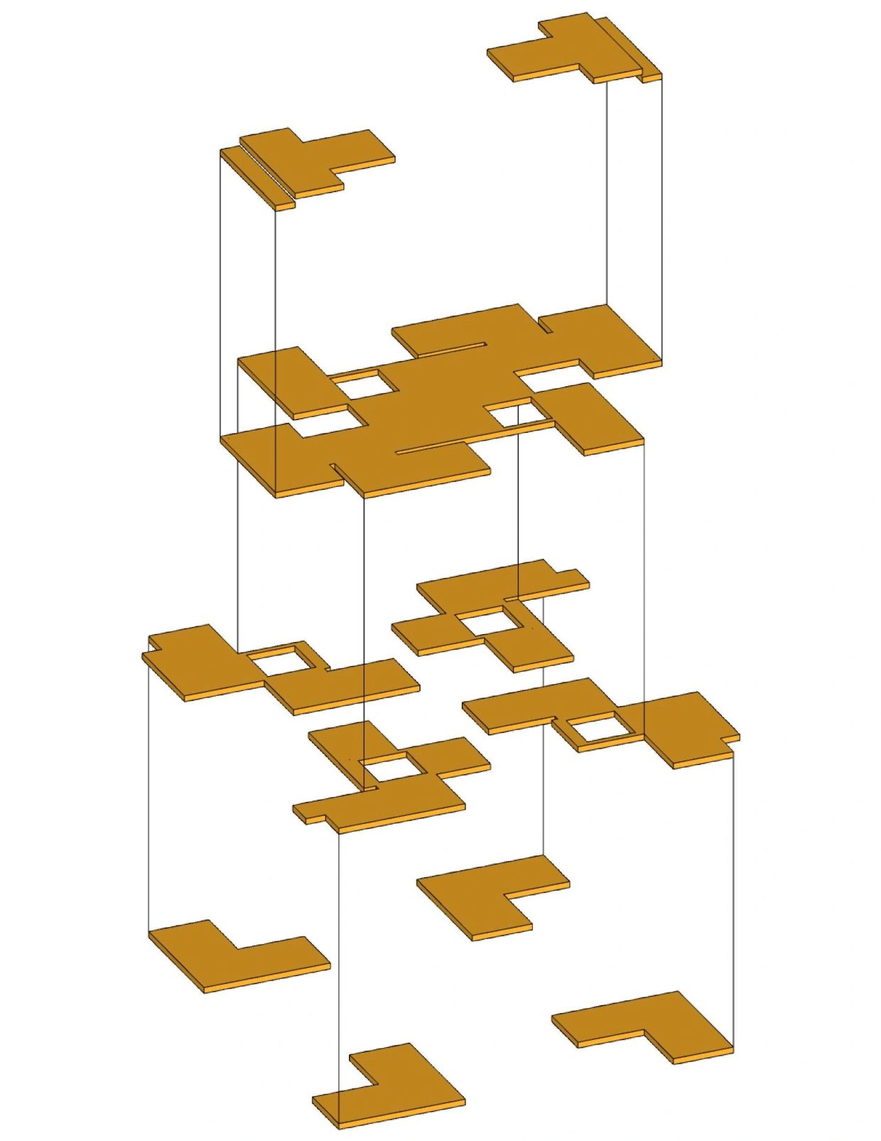 The playhouse has three floors, each with multiple entry and exit points. The top floor has one central area exposed to the outside to be visible through the glass tabletop.