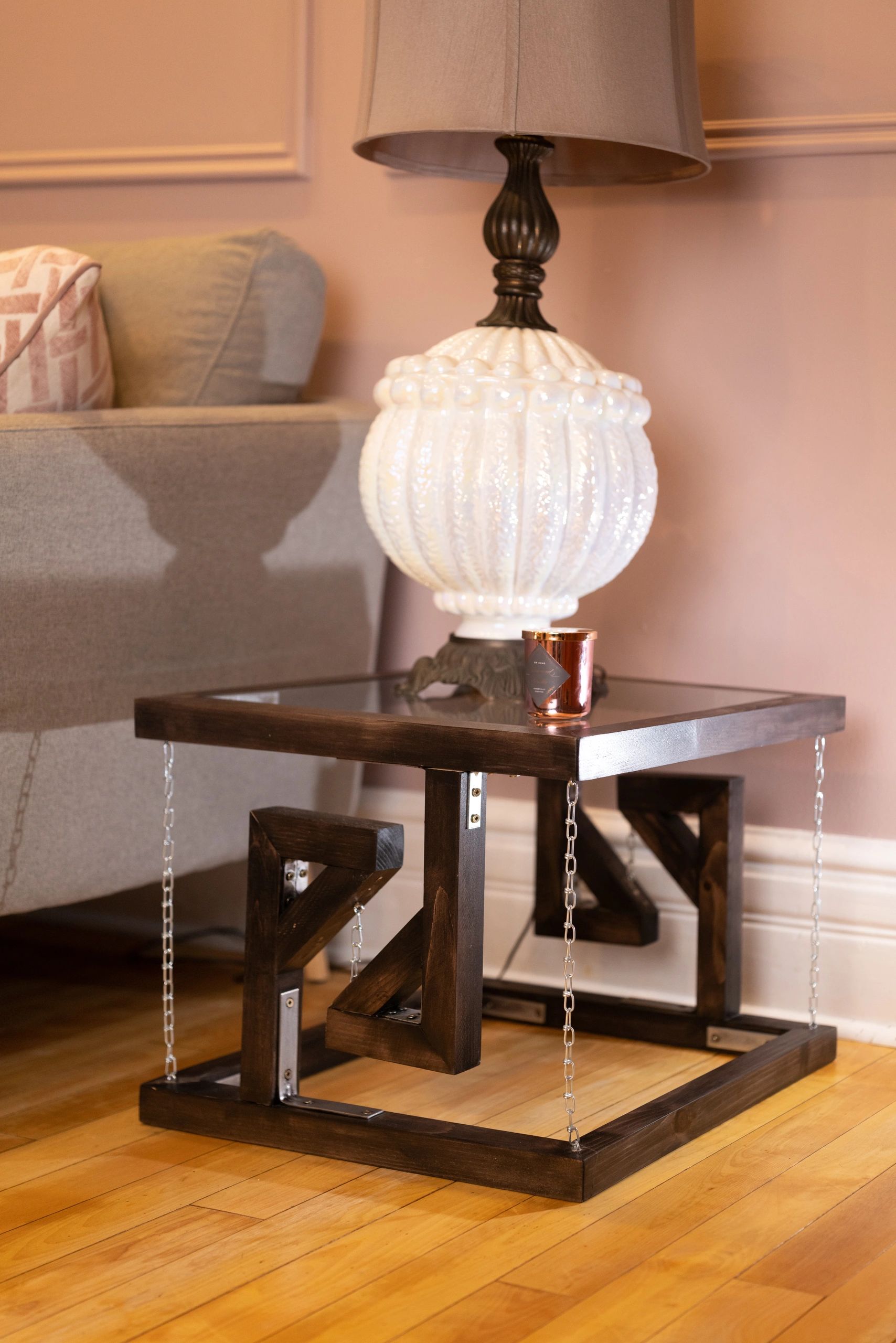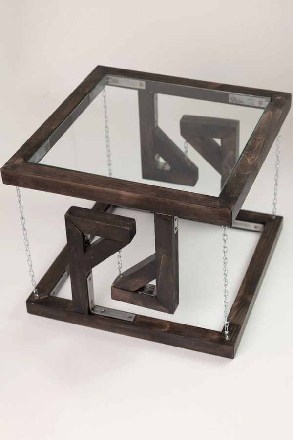 The table has a fairly simple yet elegant design. I used stained 1x1's joined together using exposed metal L-brackets, matching the aesthetic of the rugged metal chains.
