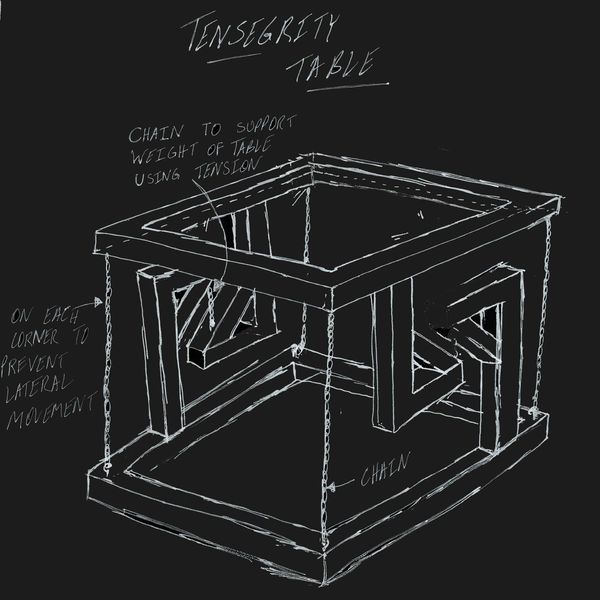 Loads placed on the table are purely supported by the two small chains in the centre. The four chains at each corner act purely to counteract moments about the central axes and lateral stabilizers, preventing the table from wobbling and tilting off axis.