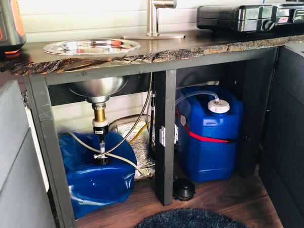 A foot pump draws water from a removable fresh water tank. The water flows out of the faucet into a sink made from a recycled stainless steel salad bowl. The dirty water finally drains into a removable grey water tank.